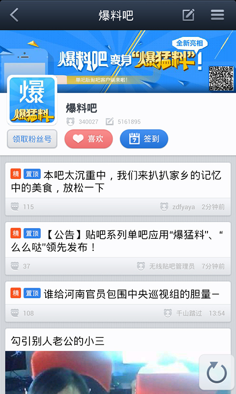 “爆猛料”是百度贴吧单吧版系列应用之一,集合最新一手消息,我伙呆热点猛料,毁三观社会百态,娱乐八卦大小事,想要速度曝光,就来这里爆猛料吧!