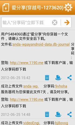 “爱分享”是一款可实现即时文件上传、下载与分享的移动互联网产品。通过“爱分享”你可以抛弃数据线,随意通过电脑或手机发送与接收文件。你也可以随时随地在手机或者PC端管理上传的文件:分享到新浪微博、腾讯微博、人人网等知名社交平台,你也可以通过“穿越号”向好友客户端推送文件。