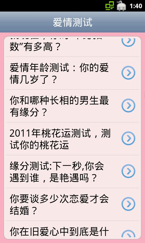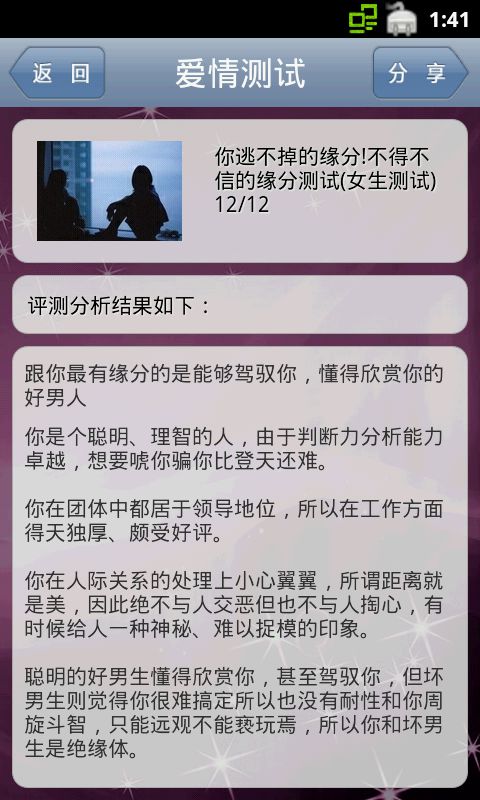 《爱情测试》涵盖了爱情心理测试的多种常见的测试方法,使您丰富日常生活,以娱乐的心态进一步了解自己的爱情观,通过简单的答题互动,系统会帮你分析出你的性格,你的爱情观.每个人都想拥有美好的爱情,在我们步入新的一年时,你有着怎样的爱情憧憬呢?如何改善和爱人之间的感情关系呢?爱情测试会告诉你答案。