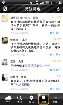 爱车一族交友聊天的新天地,在这里你可以评论和转发精彩的族群内容,收藏话题、发表微博,与共同兴趣爱好的爱车朋友畅说天地