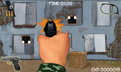 这是一个简单刺激又具有挑战性的射击训练游戏,考验你的反应能力,音效逼真,不玩一定后悔!游戏中有训练场地、车库加油站、射击画廊三个场所供你选择,屏幕右上角是扣动扳机,左上角是装子弹,另外,还可以购买一些枪械供我们选择使用。出现的靶子或者其他目标需要你快速瞄准射击,其中射击画廊里出现的小鸭子是游动的,反应一定要快。