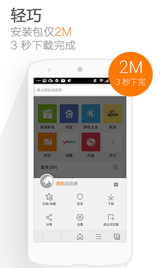 ★★★猎豹浏览器★★★视频离线下载0流量看片;百万影视剧综艺节目随时追;Flash等百种格式万能视频播放;安装包2M 下载仅需3秒;0秒启动,网页浏览提速100%。