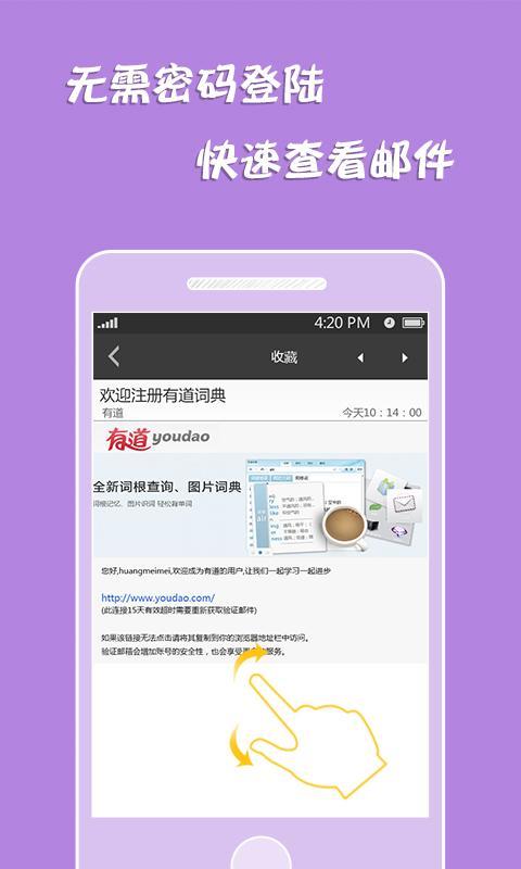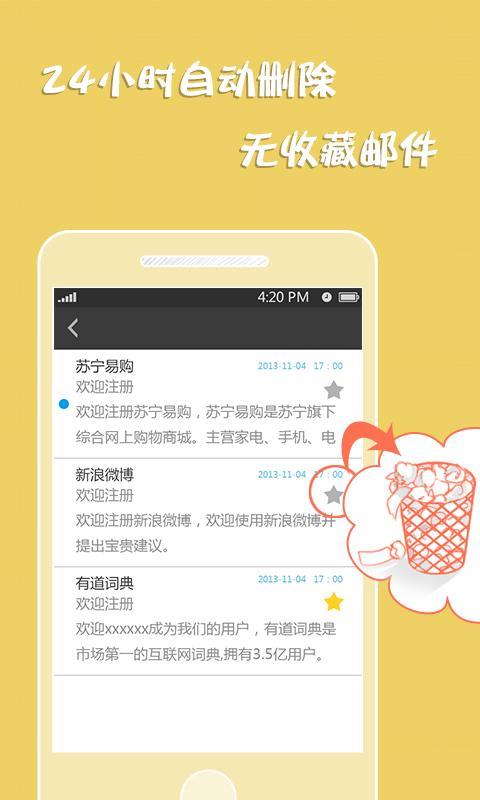 猪邮自去年9月份正式推出后,已经获得了近10万个用户,每天接受邮件3万多封邮件。猪邮作为“注册专用邮箱”的概念,越来越受大家欢迎。2.0版本是一个更为完整的“网络注册”工具。 1:邮箱免申请:一键一个邮箱,为您提供最多3个邮箱。 2:注册信息保管:收到注册验证邮件后,自动帮您保存的注册信息,方便查找。 3:邮件自动整理:收件箱只显示24小时内的邮件,历史邮件按照发件地址分 类保存,清楚明了。 4:无垃圾邮件骚扰:24小时将自动删除非收藏邮件,帮你清除垃圾邮件。 5:登录简单:点击猪邮,无需输入账号密码,即开既使用。 猪邮是一个注册专用邮箱,与传统邮箱(GMAIL,163)有着明显不同: 1:不能发邮件,因为注册方发的邮件都是不需要回的。 2:没有密码,因为猪邮只能在您的手机上用。