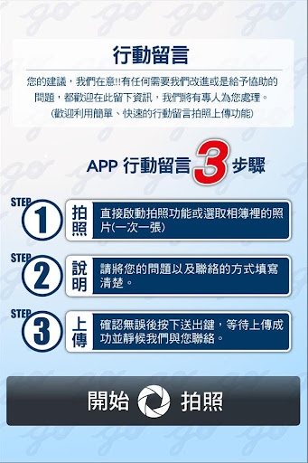 ●行動留言:可利用APP開啟手機相機功能上傳照片與反應意見留言。
