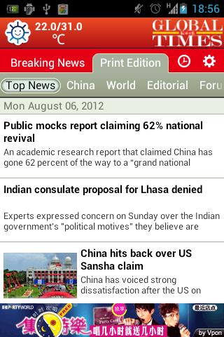 《环球时报》英文版 (Global Times) 的官方安卓应用。内容包括每日报纸的时政新闻、经济报道、深度采访,以及独家社评和评论等,同时还有体育消息和文化娱乐新闻。此外,该应用还有实时更新的网站的内容。读者更可以通过日历功能查阅往期文章。