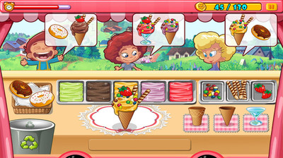 游戏的玩法很简单,你要根据顾客的需求来制作各种食品,冰淇淋,汉堡,蛋糕和各中饮料,咖啡等,完成后递给顾客就可以收钱了,而顾客的要求很直接的浮现在头顶,你只需要动作迅速就可以获得顾客的认可。