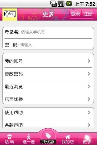 更多:包括本应用的账号注册登陆、分享打分、意见建议、最近浏览等功能,与各大商城,与朋友进行互动。