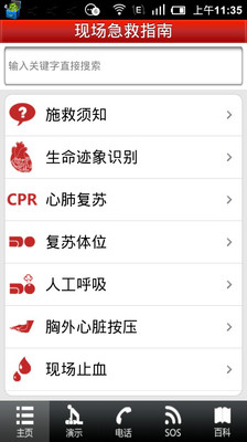 [现场急救指南]由急救专家编制,汇集了国内外有关损伤及急症现场救护的知识和技法,综合、全面、简洁、实用、图文并茂,可以帮助用户在遭遇紧急情况时开展及时有效的伤病救护。即便是完全缺乏急救常识的用户,按照本指南提供的方法和步骤科学组织施救,同样可以发挥重要的甚至决定性的作用。
