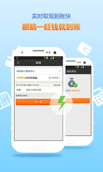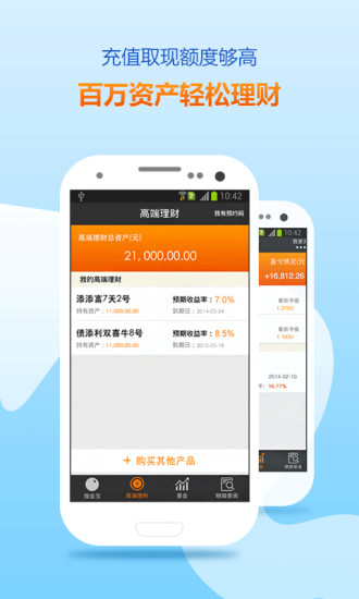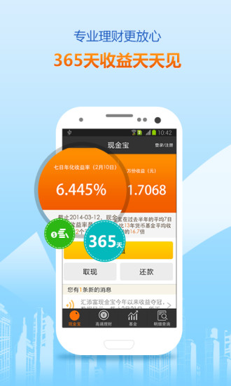 遇到过许多手机理财工具,依然独爱汇添富现金宝,你若选错,后悔无期!现金宝,最受欢迎的手机理财应用,全行业下载量稳居NO.1!各大应用市场好评如潮,千万粉丝追捧的互联网当红理财神器!专业理财绝对的不二之选!现金宝,由汇添富专业互联网金融团队为您打造的专业移动理财工具,集现金管理、基金交易、高端理财、信用卡还款等多种功能于一体,致力于成为您最贴心的掌上理财管家。截止2014年3月12日,汇添富现金宝货币基金半年以来平均七日年化收益率5.837%,是同期活期存款利率的16.7倍,业绩稳居全行业前列,赚钱实实在在!亲们,赶快去体验吧!