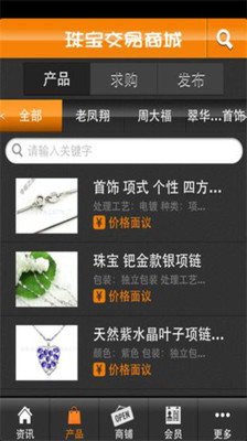 珠宝交易商城是以专业提供珠宝资源为基础的网络媒体,致力于为珠宝爱好者提供全面的行业资源和资讯服务,是最具商业价值和最具发展潜力的专业网络媒体。该客户端面向全国招商,各大企业可在该客户端上发布供求信息,发布广告,让各大企业以及广大客户更为便捷。珠宝交易商城以橙色为主色调,更能突显美感,该客户端向广大客户展示了一个大型的珠宝交易商城移动互联网门户平台,以便捷的浏览方式、强大的应用功能,最新的资讯信息,为广大客户提供了一个丰富的珠宝交易商城信息平台,时时刻刻的为您更新,让您爱不释手。