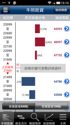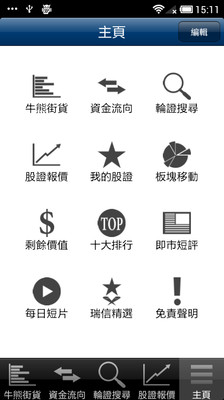 应用程式功能完备, 资料详尽, 经优化后的各项功能及介面, 更切合使用者需要, 其内容包括:牛熊证街货分布图、市场资金流向数据、详尽股证串流报价市场所有牛熊证剩余价值、各板块移动情况及相对恒指表现、十大股证排行榜(成交额, 上升, 下跌, 相关资产成交额)、轮证搜寻器, 恒指牛熊证矩阵瑞信认股证/牛熊证精选个人股证组合自选功能捷径设定。