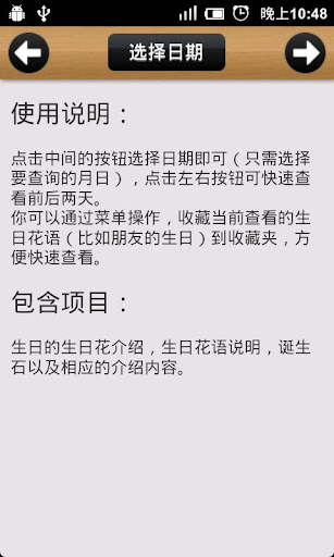 点击中间的按钮选择日期即可(只需选择要查询的月日),点击左右按钮可快速查看前后两天。你可以通过菜单操作,收藏当前查看的生日花语(比如朋友的生日)到收藏夹,方便快速查看。