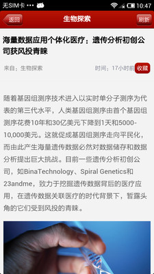 这是一款集文字,图片等众多功能为一体的生物资讯类客户端软件,可以让您在第一时间内了解到国内外最新的生物资讯,最热门的生物专题和最有趣的生物图片,并且还可以对自己感兴趣的文章进行收藏.也可以把您的宝贵意见及时的反馈给我们.