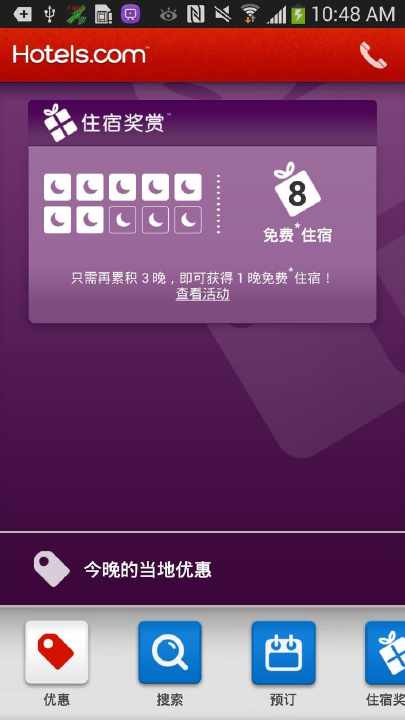 Hotels.com 住宿奖赏? - 预订 10 晚即可免费住宿 1 晚。在 Hotels.com 无线客户端上预订的所有符合条件的酒店都能计入住宿奖赏?帐户,您可通过无线客户端查看累计情况。
