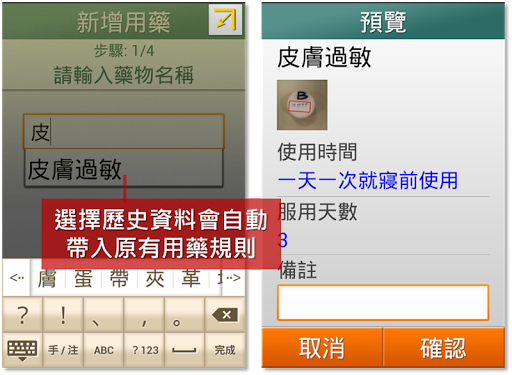 *有歷史用藥記錄功能,新增用藥時,只要選擇歷史資料就會自動帶入相關記錄,無需重複輸入資料,非常適合慢性疾病等長期用藥者使用。