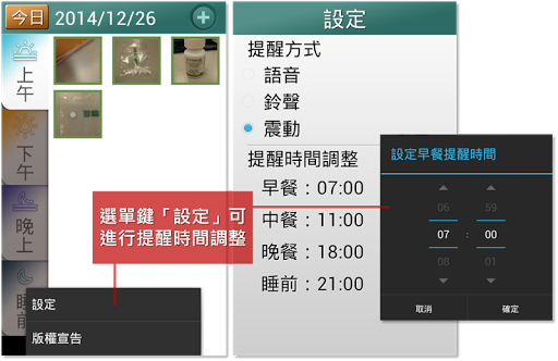 *時間到了自動鬧鈴提醒用藥,鬧鈴時間可進階設定。