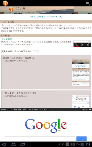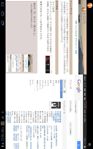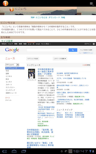 「にこいち」は、画面を二つに分割して使用できる、Androidタブレット用のWEBブラウザです。ジェスチャーでの操作や固定幅での画面分割機能などの機能を搭載しています。