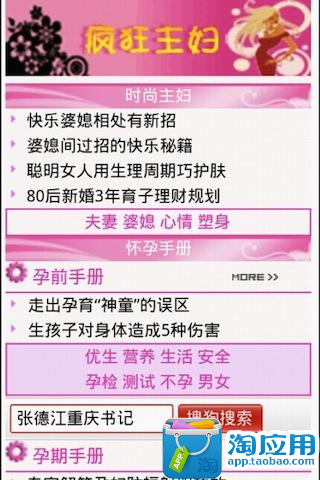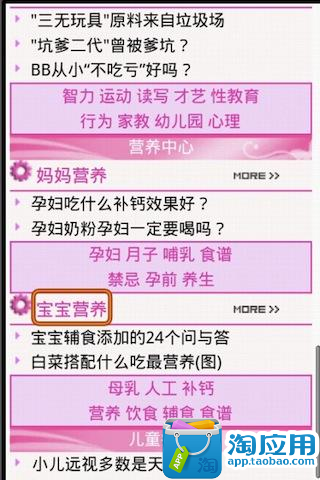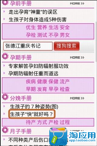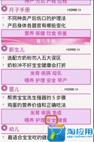 这里有孕前手册,孕期手册,分娩手册,月子手册,新生儿,婴儿和幼儿手册,早期教育,妈妈营养,宝宝营养等等知识。 还有更多呼吸 消化 皮肤 疫苗 急救 用药 眼科 护理 口腔 五官 体重 血友 生殖 睡眠 骨科的知识。