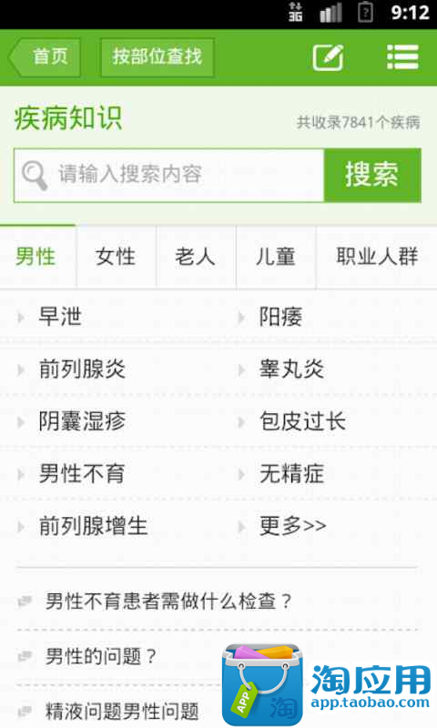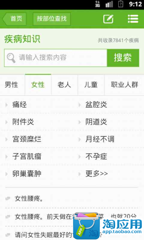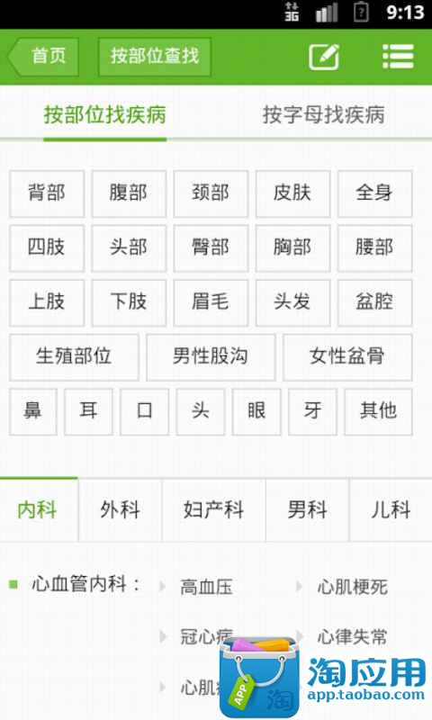 用户可以通过不适的部位进行查找,也可根据不同的科室如:常见疾病,呼吸内科、消化内科、泌尿内科、心内科、血液科、内分泌科、神经内科、小儿科、感染科、普外科、骨科、神经外科、肝胆外科、泌尿外科、烧伤科、妇科、产科进行查询其症状描述和相关知识
