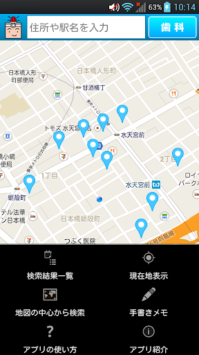 住所や地名、駅名をテキスト入力することにより、指定した地域周辺の病院を探せます。