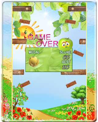 每個人都希望摧毀瘋狂的蘋果。這不只是瘋狂也能飛。蘋果是你的英雄,你需要防止,那你的蘋果將由董事會砸了。你必須避免危險的障礙,上升到頂部,並獲得積分。較高你飛更多的積分,您可獲得。如果你是一個靈巧的球員,比你得到像青銅,白銀,黃金和鉑金獎章獎勵。祝好運)