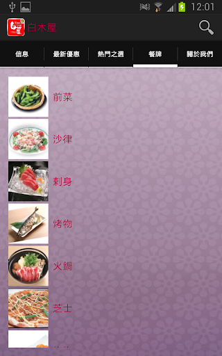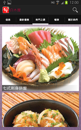 白木屋居樂屋 (Shirokiya) Android 手機程式 (Apps), 介紹白木屋居樂屋的食品如炸泡菜魷魚, 牛油帶子及蟹柳焗薯蓉, 最新推廣及 店舖資料等.