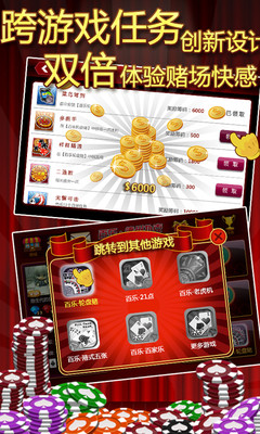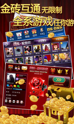 3.独特的货币互通机制:所有百乐系列游戏均采取统一的货币互通系统。在游戏中获得的金砖可以在其他百乐系列游戏中消费或转化,让百乐?德州扑克成为您源源不断的金山!
