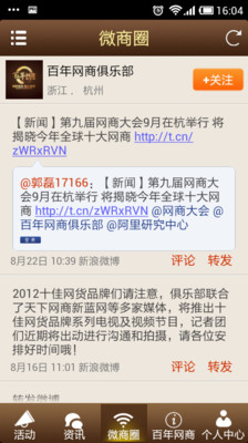 2. 用户可以关注百年网商俱乐部官方微博动态,以及组委会成员和明星会员的微博动态;