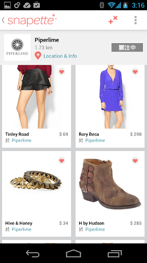 Snapette 根據你所在的地方甚或是全世界,提供最好的精品店、商店和品牌的簡易上手購物指引,幫助你購買專人設計的時裝和熱賣品。你可以看看全球最新的流行趨勢,或是瀏覽附近商店上架的商品。