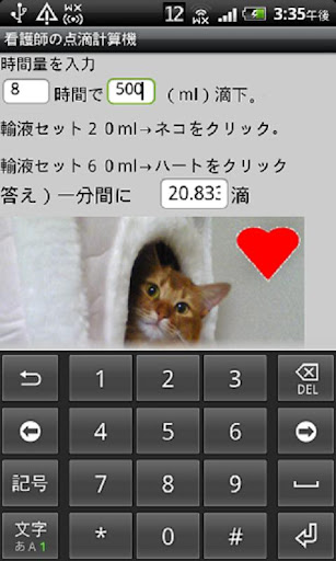 点滴の滴下速度を可愛いネコが計算してくれるアプリです。