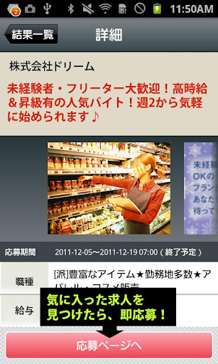 そんなとき、このバイトアプリが大活躍。ブラウザを立ち上げる手間もなければ、バイト検索の待ち時間も短縮。さらには1ヶ月以内という条件選択もしないで大丈夫!このバイトアプリを立ち上げるだけで、旬なバイト情報をくまなくチェックすることができます。