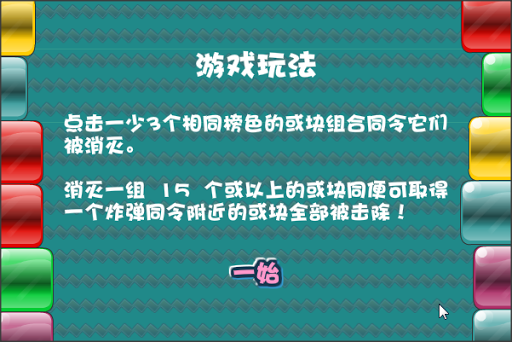 刺激无比的拆砖竞技赛,现在让您亲身参与!在这个游戏里,您的目标是点击3个或以上相同颜色的砖块组合,令它们被消除。游戏开始时,许多不同颜色的砖块会排列在游戏区里,而您可以点击最少3个的同色砖块组合,令所有与之相邻的同色砖块都被消灭。当某直行的砖块被移除后,其余直行的方块就会合并。若您能够同时消除15个或以上的砖块,您就会得到一个炸弹,令它附近的所有砖块被移除。注意新一行砖块会定时在游戏区底部出现,若果砖块堆叠至游戏区顶部,您就输了。火速行动,把所有障碍物拆除吧!
