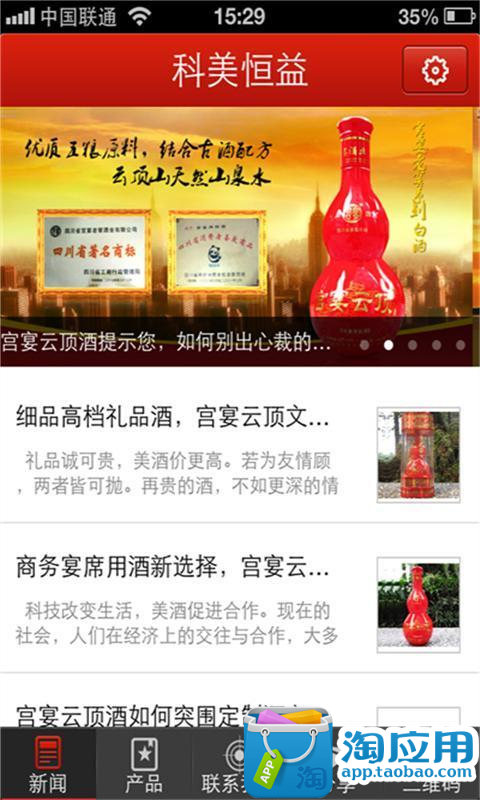 展示科美恒益的产品,新闻,并提供分享与二维码功能,联系方式等。 宫宴老窖隶属于北京科美恒益商贸有限公司,科美恒益位于酒城宜宾、泸州近临的金鹅小镇,这片神秘的土地环境清幽,风光汤觯山清水秀,古老的石牌坊古驿道沉醉在山魂水魄之间;驼马的铁蹄随着历史圆寂,几千年古文化的血脉却在传承;就是这一片纯净的山水孕育了宫宴,就是这一段厚重的历史铸就了宫宴的气度;宫宴带着与生俱来的晶莹剔透和冰清玉洁,将那远去的一段段历史画面、将那没落的一座座道德丰碑演译得淋漓尽致!