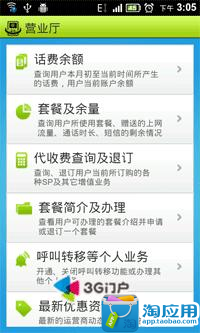营业厅是一款专业的手机资费管理软件,支持话费、余额、流量、积分、套餐使用量、历史账单查询。轻松办理、退订套餐和代收费,并可办理呼叫转移、一键开启或关闭上网功能、密码修改和重置等功能 。