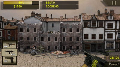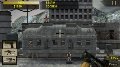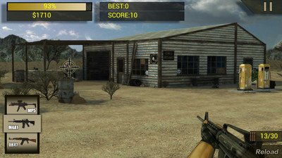战斗中有多种武器供你选择,手枪,AK47,MP5,重机枪等等。左手滑动操作瞄准器进行瞄准,点击屏幕右下角显示子弹的上方区域进行开枪射击,点击Reload装填弹夹。