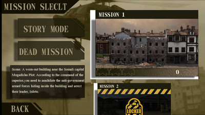 你是突击部队中的一名精英,单兵作战能力超强,被派去执行剿灭恐怖分子的任务。总共有8个任务需要完成,难度当然会越来越大,完成了一个任务才能解锁下一个。