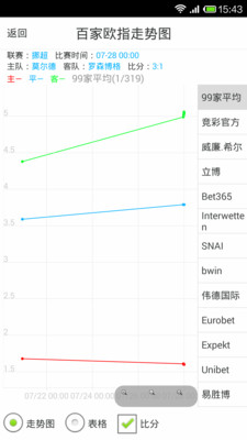 竞彩走势图是一款竞彩足球赔率数据分析软件,提供及时足球赛事信息、比分信息、百家赔率等数据。提供上百家公司的即时赔率数据,以曲线走势图的方式直观的展现赔率的变化。