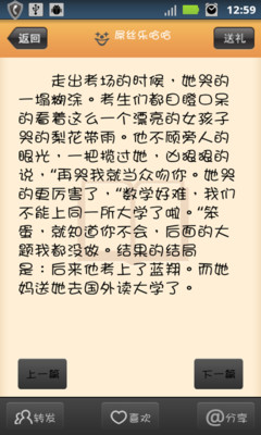 本应用提供各种笑话,有经典笑话,幽默笑话,爆笑笑话,冷笑话,小笑话,短信笑话……个个笑话都让