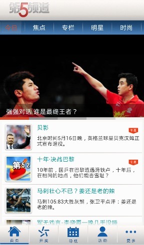 第5频道官方运营的综合服务类手机客户端,主要功能包含:重要体育新闻,重要赛事推荐,重要比赛直播提醒,开奖信息查询,赛事节目表查询,互动交流活动等等.