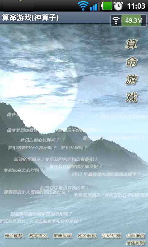 算命游戏:包括周公解梦、数字吉凶、运程读解、姓名配对(情侣)、民俗预测、心理测试、星座血型配对等模块。界面清闲自然,功能繁多,是你生活愉乐必备小工具!
