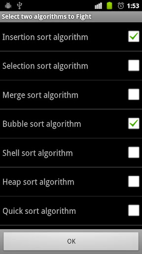 這是一個簡單的可視化排序算法的應用程序。你可以選擇兩種算法同時進行運算看看誰先完成。你也可以隨時查看算法的具體介紹。