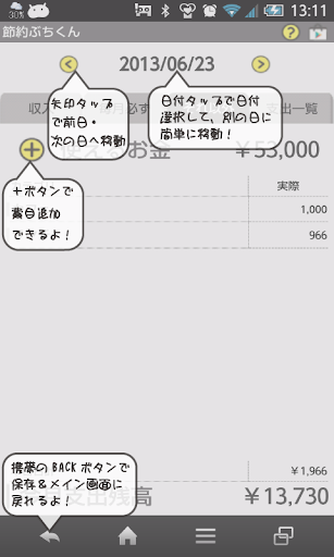 予算と実際の収入・支出の登録より、今月使える予定のお金はいったいいくらなのかをきっちり把握するための節約できる家計簿アプリです。