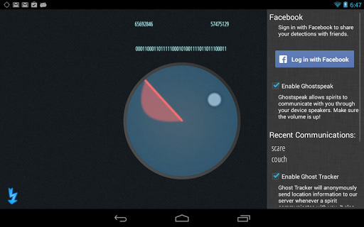 鬼魂和其他烈酒頻道消息給你,通過應用程序,並將其顯示在屏幕上讀出。該雷達的基礎上,拿起你身邊的各種能量讀數顯示圖形的光點。它的純數字形式顯示在原始數據的。