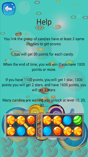 在可愛的造型很多糖果都在等待你解開在10級,20,30,...有了驚人的圖形和朗朗上口的聲音,你將有一個驚人的時間來放鬆。此外,你可以比較分數及功能排行榜世界挑戰你的朋友。
