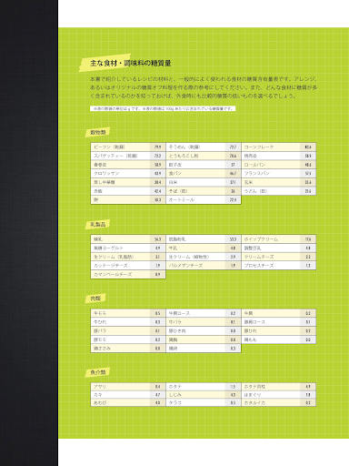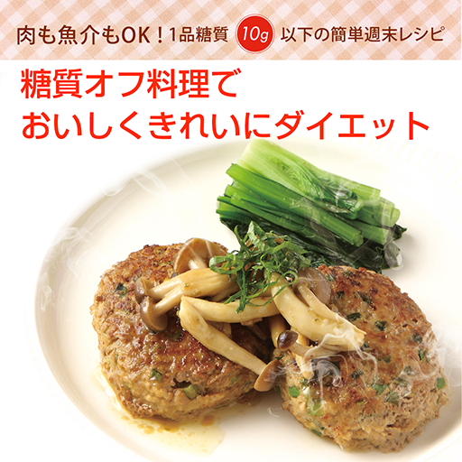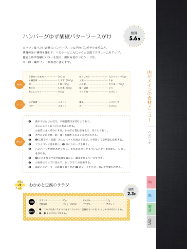 健康、ダイエットに関心のある方のためのレシピアプリです。摂取すれば脂質に替わる糖質を多く含んだ食材を使わず、各メニューが糖質10g以下で付け合せも含め、しっかり満腹になれるメイン料理を、肉・魚介・野菜と食材別に紹介しています。また、食材別の糖質量リスト、食材を選択すれば関連メニューが一括でわかるオリジナルインデックスといったアプリならでは機能も充実のレシピ本になっています。