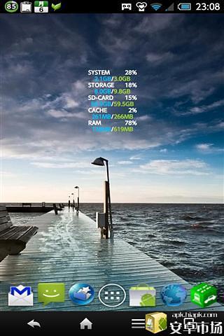 [功能] 我利用存储(系统内置),SD卡,如RAM,磁盘驱动器空间和总容量。 ?更新时间:当启用(默认60秒),显示更新的使用率,空间,总容量。 ?您通过触摸的文字显示的设定画面。 ?文字颜色,显示/不显示的文字,你可以改变设置屏幕更新之间的秒数。