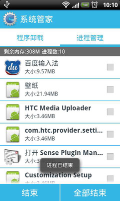 4.轻松结束系统进程,支持单个/多个/全部结束进程,为你的手机腾出更多的空间,提高手机运行速度。
