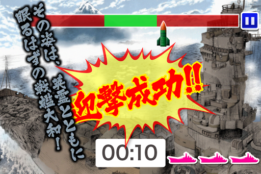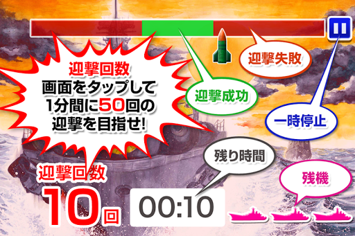 タイミングバーに合わせてタップし指定の範囲内にミサイルアイコンが納まると迎撃成功となります。