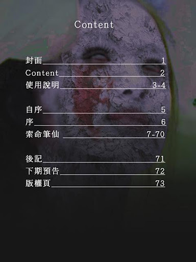 忠告:本漫畫帶有恐怖成份,孕婦、心臟病或相似疾病、心智未成熟者均不要閱讀,如有任何意外,本出版社及作者均不會負任何責任。