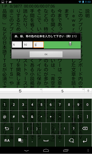 「文字の色」・・・・文字の色を変更できます。赤緑青の割合を数字で入れた後、シークバーで濃さを選んで下さい。ダイアログ以外の場所をタップすると戻れます。赤緑青すべて0にすると色が変わりません。データは保存されますので、次回からはこの色が表示されます。